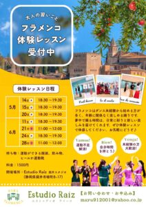 フラメンコはダンス未経験から始める方が多く、年齢に関係なく楽しめる踊りです。 夢中で踊る時間は、日常に彩りと新しい楽しみを届けてくれます。 ぜひ体験レッスンで体感してください。お気軽にどうぞ♪